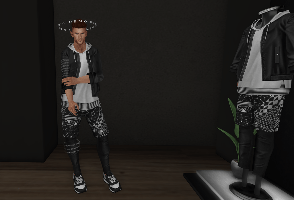 I like it when a demo can be unpacked without having to rez a box on the ground or when the demo items land in your inventory ready to be worn. It means you don’t have to go home to put things on. The first thing I tried on right there and then at TMD (hence the DEMO markings) and which actually fitted with some help of the alpha hud, was a “blouson” jacket with a long t-shirt with side slits and a hood combined with a pair of layered pants with a geometric pattern. I imagine I’ll be seeing this outfit from Scars around on the grid quite at bit. The t-shirt was also available separately but wasn’t suitable for the David body.