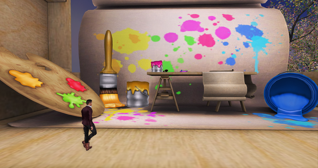 I landed in the middle of what seemed to be a giant’s artist’s studio and half expected to hear a rumbling “fee fie foe fum…” but it turned out that there were only average sized people perusing the stands. Besides gacha sets, there were also plenty of items that could be bought in the good old direct way. There didn’t seem to be a specific theme for the items and it was a mix of clothing, hair, jewellery, decor and furniture. As usual male avatars were underrepresented and I’m not too sure about that claim of hundreds of deeply discounted items. Naturally I did not pick up any of the gifts for female avatars, so there could be some wee gems in there that I’m not aware off. I’ve lumped some bits and pieces together from the gift stash to take a picture and I’ rather charmed by the pineapple lamp and the cute little giraffe. There are worse ways to spend an hour or so in SL than by looking at cute stuff and getting freebies.