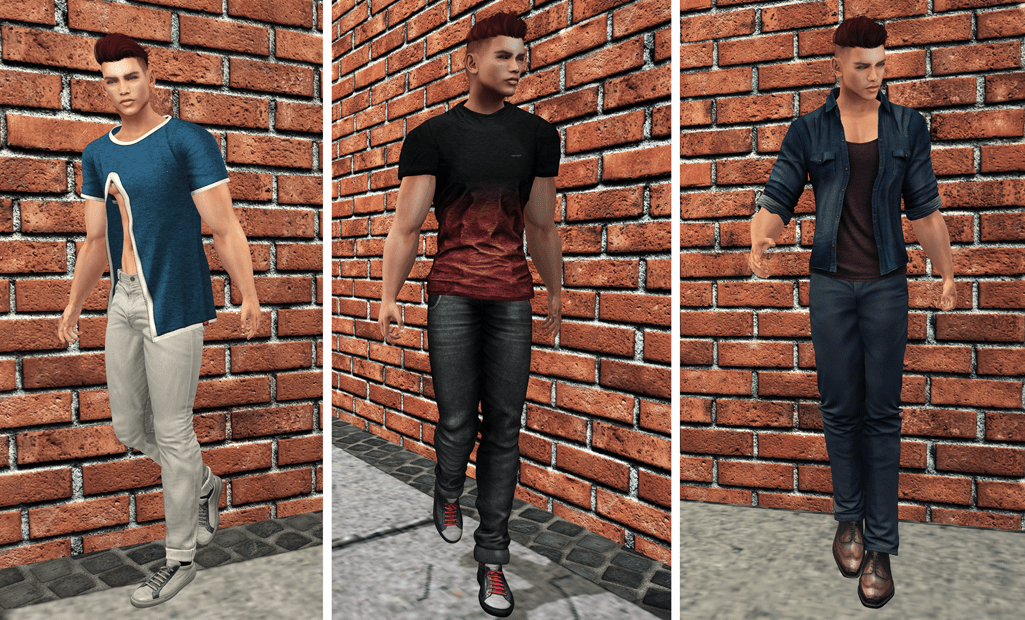 Left: Having recently purchased the EXMACHINA full avatar, I took another look at the Egoisme clothing line and was yet again baffled by the fact that much of their range bearing the “Exmachina” name wasn’t really made for this body. After trying on and discarding some items I eventually settled on a long t-shirt with a sexy diagonal zipper. I was able to make the fitmesh version work with some shape editing and paired it with the Broberry jeans and Chase sneakers from Deadwool.