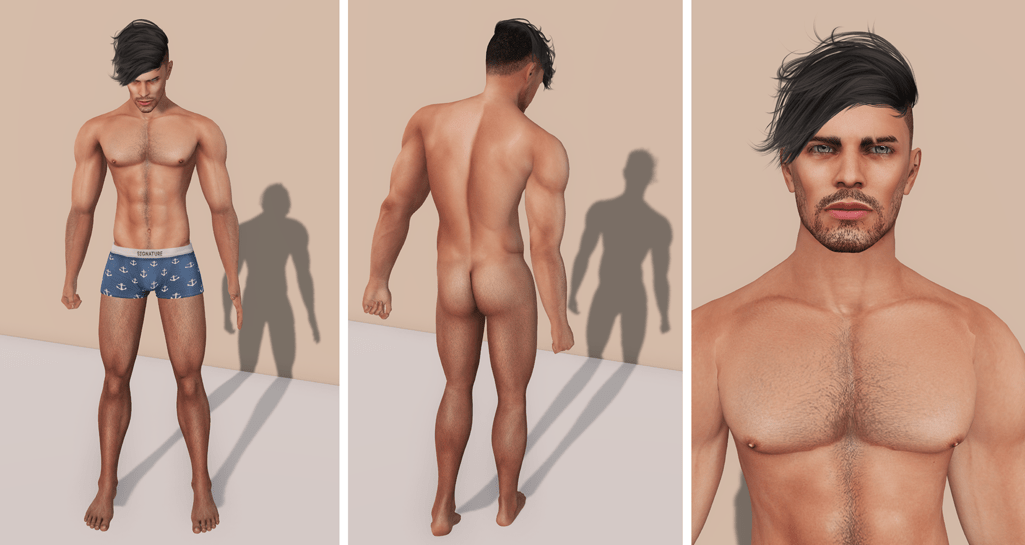 As something to kick your Signature experience off with, the basic skin for the body and head isn’t too shabby at all. Obviously sticking with this skin will stop you from reaching a higher level of individuality, but it’s’ quite crisp with very nice muscle definition and comes in 12 tones. There are several options for hair bases, eyebrows and beards too. You can of course shop around for something interesting, like slashed eyebrows (VYC Homme) and body hair (Nivaro*) to give your look a bit of an edge. The head now comes with its own eyes, but I favor the Vermeer mesh eyes. Of course you can create your own shape and before you know it, the standard Gianni will be but a ghost and you’ll say hello to a ruggedly handsome green-eyed mysterious man! Some of the Signature hair bases work well as a buzz cut, but hairstyles can have a huge impact on your look (as in real life). The windswept “Hysteria” hairstyle by Stealthic is all the buzz right now, so don’t expect much individuality when you start rocking it, but at least it looks bloody amazing in my (ahem) modest opinion.
