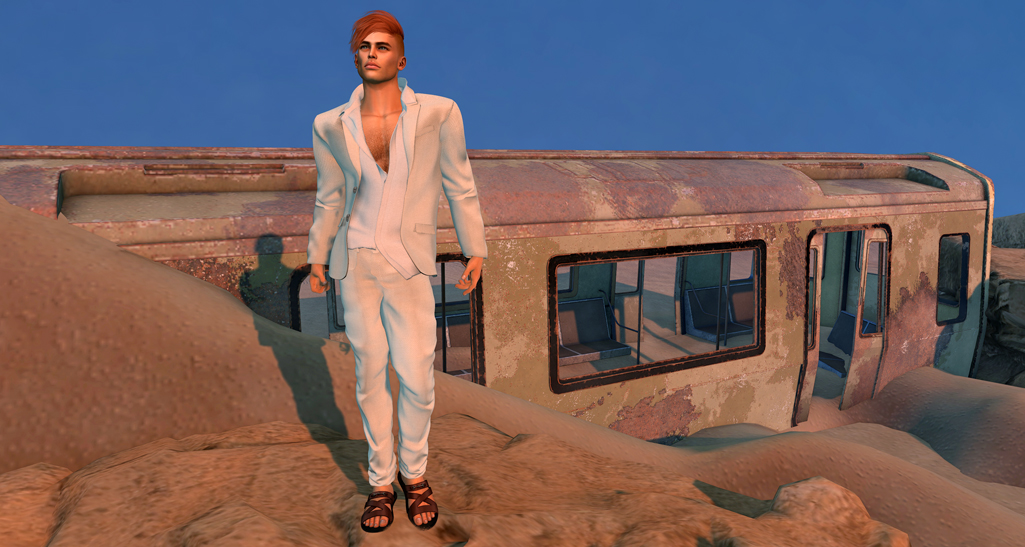 (Body: Belleza Jake. Head: Catwa Stanley. Skin: standard skin for Belleza body + matching applier for Catwa head, all included with body. Hair: Stealthic ‘Hysteria’. Footwear: Belleza ‘Andrei’ sandals.)