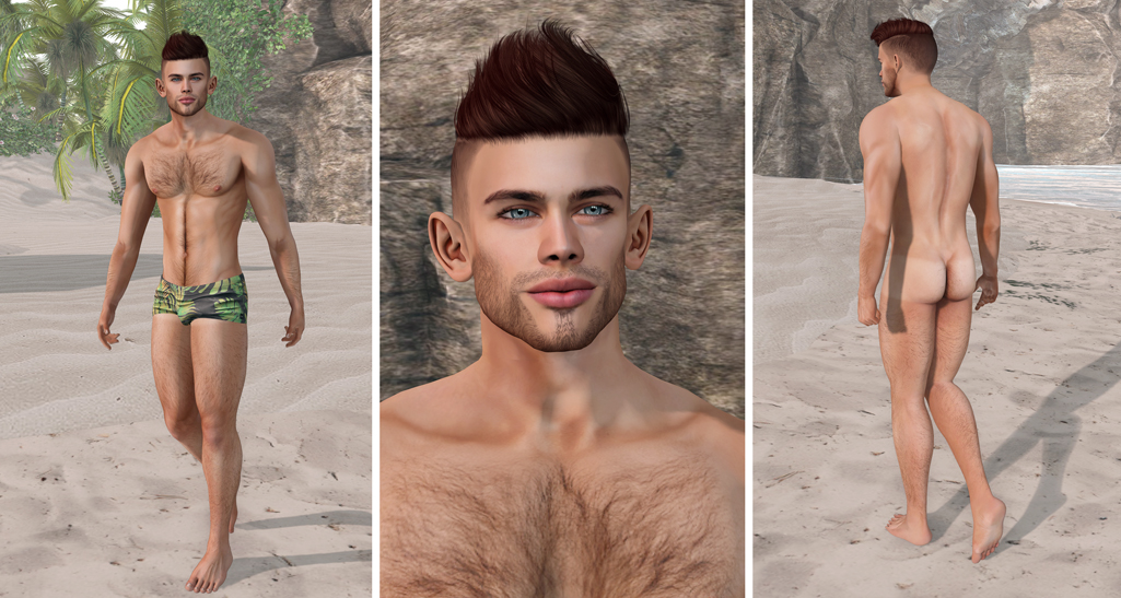 That’s it for this round of head juggling. I used Stealthic hair, NSS mesh eyes and Mandala mesh ears throughout this exercise (except for Leon, those are his own ears). As usual when I’m showing off bodies and heads, I kept the use of fabrics to a bare minimum. To suit this purpose, I found some new things to wear with Geralt at the current round of the Signature event, which is on from the 1st till the 20th of August. From Flow I got myself a nice pair of swimming trunks with a tropical print. Then there is a simple pair of boxer briefs from Exalted and a comfy pair of joggers from Wazzer Works.