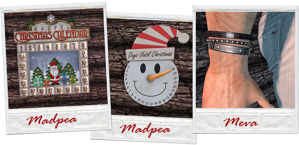 Meva has an advent calendar for their group members. The group joining fee is 100 L$ and you need to show up each day to pick up the gift of the day or you’ll be losing out. I remember a lot of nice bracelets and a sexy tank top from last year’s Meva advent calendar. It’s worth the 100 L$ fee, if you’re in need of accessories and like their style.