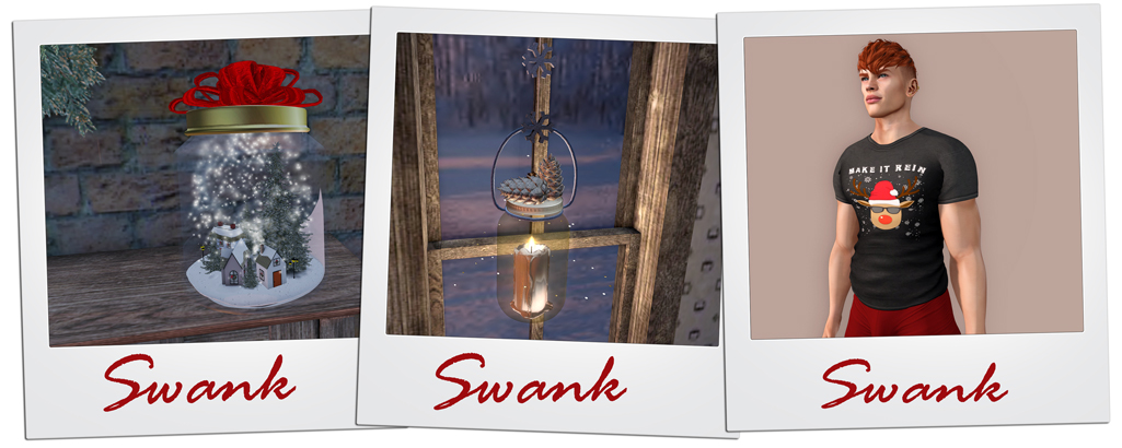 Swank have their usual monthly event, but of course as it’s December, there’s a winter wonderland theme and you can find gifts dotted around on the sim. You don’t need to be in any group and all gifts are free. I grabbed a cute mason jar snow globe, a hanging lantern (also made from a mason jar. hipster alert!) and a fun t-shirt.