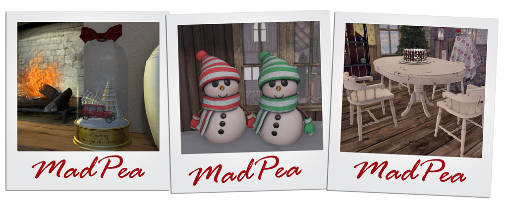 First I wanted to open a few more little doors on the MadPea Christmas Calendar. You can purchase this calendar for $L500 and of course you’ll find 24 items inside. That’s pretty good value for money. You get sweet items like the “Dashing trough the snow” globe, two very endearing small snowmen (well, a snow boy & girl, apparently) and a charmingly shabby dining set.