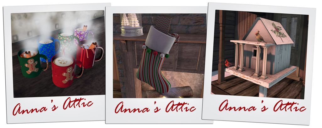 I discovered an advent calendar at Anna’s Attic. You don’t need to join a group and you can collect all the items of the past days. Just show up and keep on clicking, stuff all those goodies down your trouser legs and walk away whistling like nothing happened.