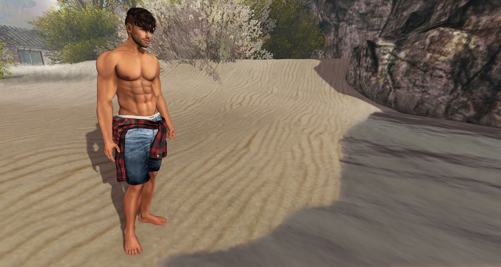 Now let’s head to the beach in these jeans shorts by Invictus, with a shirt casually tied around my waist. These shorts did not require a lot of shape editing, which was a relief. I think the Aesthetic size is the most suitable version to use with David. While I was enjoying a relaxing beach walk at Hades Love Island, I got a marriage proposal, so I must be doing something right with this look.
