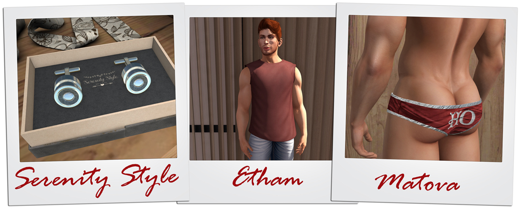 Give your wardrobe a bit of pizzazz with the Serenity Style cuff links (1 li), but you can keep things casual with Etham’s tank top (for Gianni, Jake, Slink and TMP) or just totally let yourself go and hang out in your Matova Christmas underpants (for Gianni, Jake and Aesthetic).