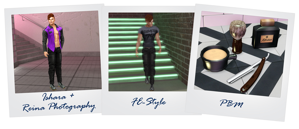 I like the cut and details on the shirt, trousers and shoes from Ishara, but I’m not too keen on the scorpion print on the back and shoulder. The pose by Reina Photography is also a hunt item.