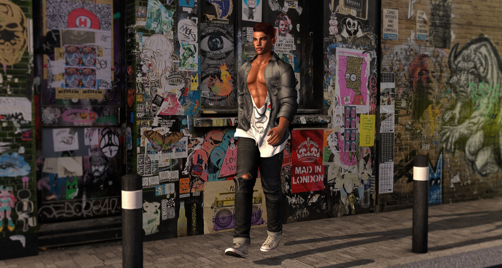 The Aitui ‘Quinn’ Jacket at MOM this mont includes a TMP size, so that meets the keepin’ it easy requirement. I couldn’t find a pair of jeans or any other kind of trousers at MOM that would work for TMP, so I grabbed the Cold Ash ‘Holloway’ ripped jeans from my inventory, cause those aren’t that old and I do like that worn look. The sneakers I’m wearing with this outfit are from a gacha set over at Semller.
