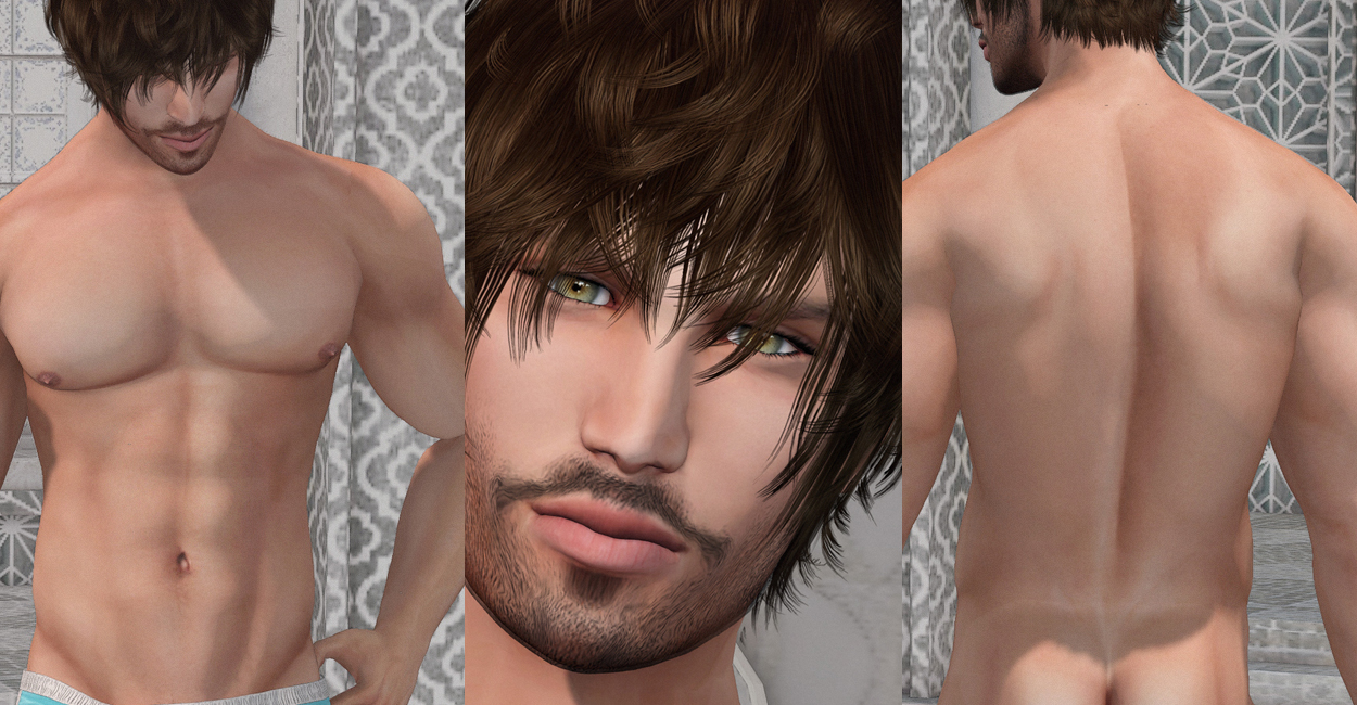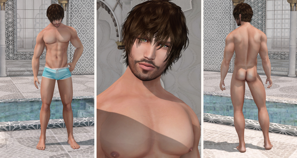 I still don’t feel super confident about applying a hair base AND a beard on the original head that is part of this avatar. It more or less worked out this time, but it still glitches every now and again, so I prefer to go for a longer hair style that doesn’t need a hair base, like Dura B&G83. The chin doesn’t look right to me without facial hair, so I applied the Bristle Beard by Birth. I clicked on “makeup” in the applier, because it gives you the option to place the beard on the layer of your choice. Layer 1 appears to be the most stable option. Don’t forget that you will need to get the Omega System Kit and install it before you will be able to use omega appliers. You’ll find that at the Exmachina store. The eyes that come with the avatar aren’t my cup of rich Earl Grey either, so I’m using mesh eyes from Avi Glam instead. The skin is one of the four standard skin tones for this body and the shape is my own work, though the package does include a shape. I wish someone would make him a nice pair of briefs that didn’t have that sideways worn semi erection going on, but that is the compromise I make for wearing something of good quality like the Thor briefs by Legal Insanity with this body.