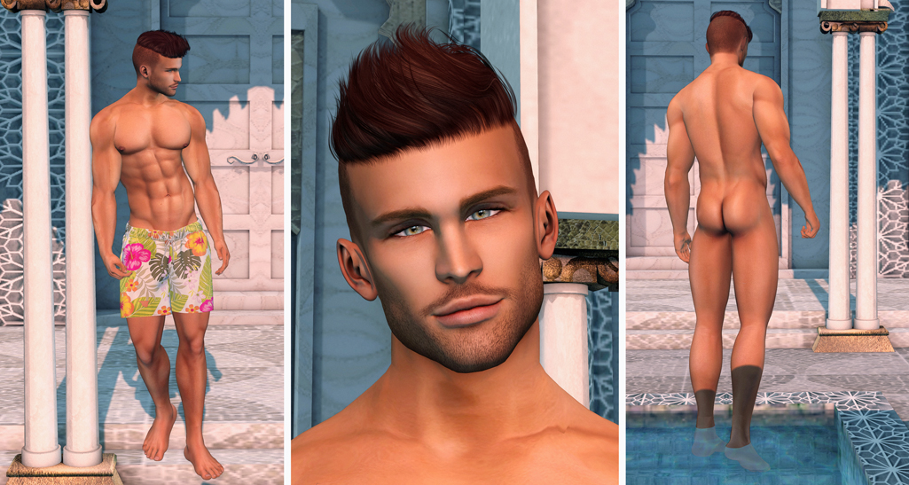 I like using 3rd party add-on mesh ears on Catwa mesh heads, like the L’Etrê basic mesh ears. You’ll find the Reach hair style at Stealthic and the eyes are the basic rigged eyes for this Catwa head with an applier from Avi Glam. The Hawaii swim trunks are by Legal Insanity.