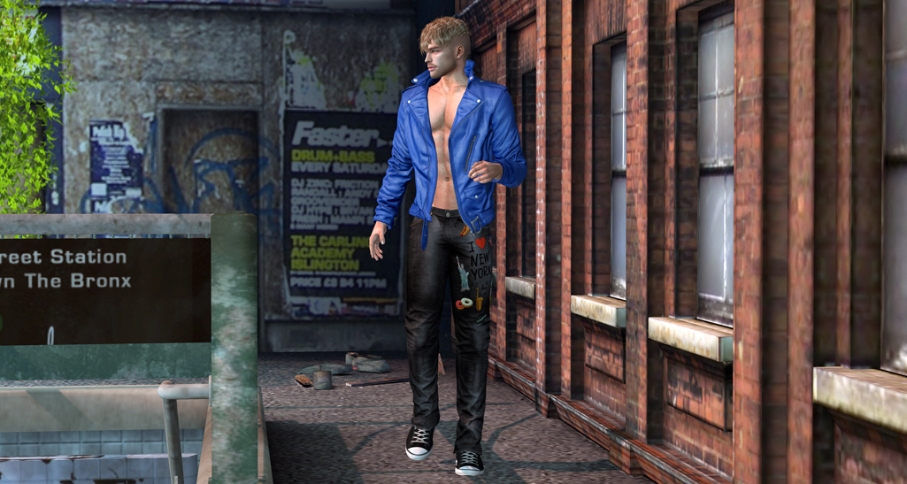 We’re jumping from one fun piece of men’s attire to another with a new pair of jeans by Tori Torricelli. I felt compelled to purchase the fatpack, because it comes with some fun prints and a chain. With all the pairs of jeans available in SL, you can’t blame me for wanting something with some more bells and whistles. You’ll find that the Enzo size is the best fit for David and if you feel it makes your legs too bulky, you can play with your shape a bit to reduce them. In any case it’s always a joy to find a pair of trousers that fits snugly without having to make serious alterations to your shape. (sneakers by Semller)
