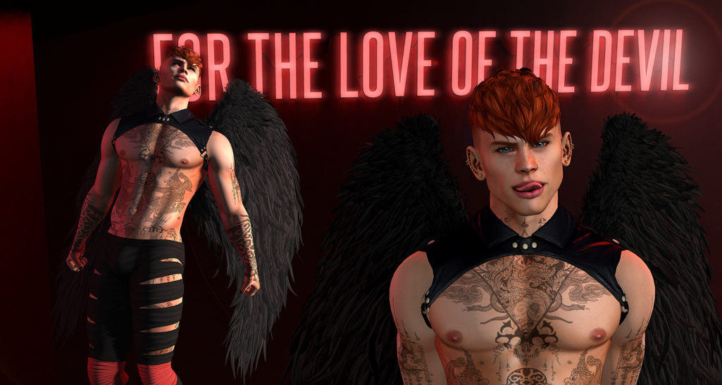 Shown on the Belleza Jake body with the Catwa Stanley head , Erwin skin by Stray Dog (that particular skin isn’t in the current Stray Dog range) and Vango Zack hair. The mesh ears are by Mandala. Tattoo by Taox and wings by Blueberry.