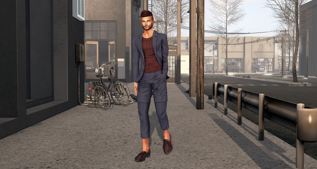 I don’t know if it will be going up in price after the event, but at Equal10 you cant get the Alric suit by David Heather complete with a colour change hud including 11 colours which you can apply individually on the jacket, sweater and trousers for just L$500. The suit is rigged for Belleza Jake and Signature Gianni. You’ll constantly have one hand in your pocket with this suit, so the other one is free for giving a high five or whatever else Alanis Morissette does in that situation. The Russel loafers I’m wearing with this suite are also by David Heater and available at Equal10.