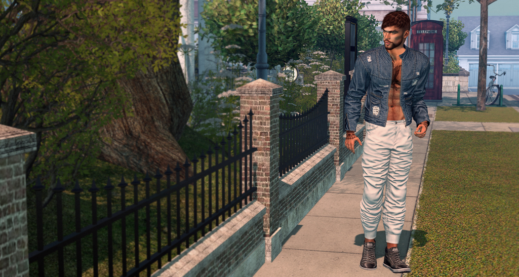 Then I headed over to Man Cave. At the current round of this event you’ll find a nice pair of trousers and a jeans jacket which you can wear with or without a t-shirt by RKKN. I had to do some shape editing to make the trousers wearable without a shirt, but nothing too major. The sneakers are currently a gift at Man Cave till this round ends on July 11th. The event is overflowing with gifts this time because it’s celebrating its two year anniversary.
