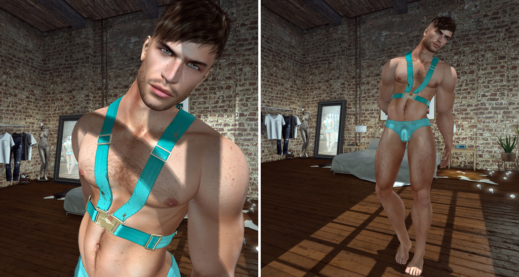 He’s a member of the Akeruka group and when Akeruka offered their Deluxe Head ‘Clay’ as a group gift a while ago, I made sure to get him one. With this alt I’m using the Belleza Jake body and the Akeruka head includes an applier for this body, so I could have left it at that with no extra cost and he would be looking pretty good. However, Stray Dog has a nice applier for the Akeruka Deluxe heads which works particularly well for Clay. The skin is named Jonatas and the Stray Dog applier for Belleza has freckles, body hair and tan line options, something that’s lacking from the Akeruka appliers. The playful “Bailey” hair by Modulus, Solstice eyes by Avi Glam and a beard applier by Volkstone finish the look. Keep in mind that if you want to add something to the head like the beard, you will need to get the Omega System Kit for this head.