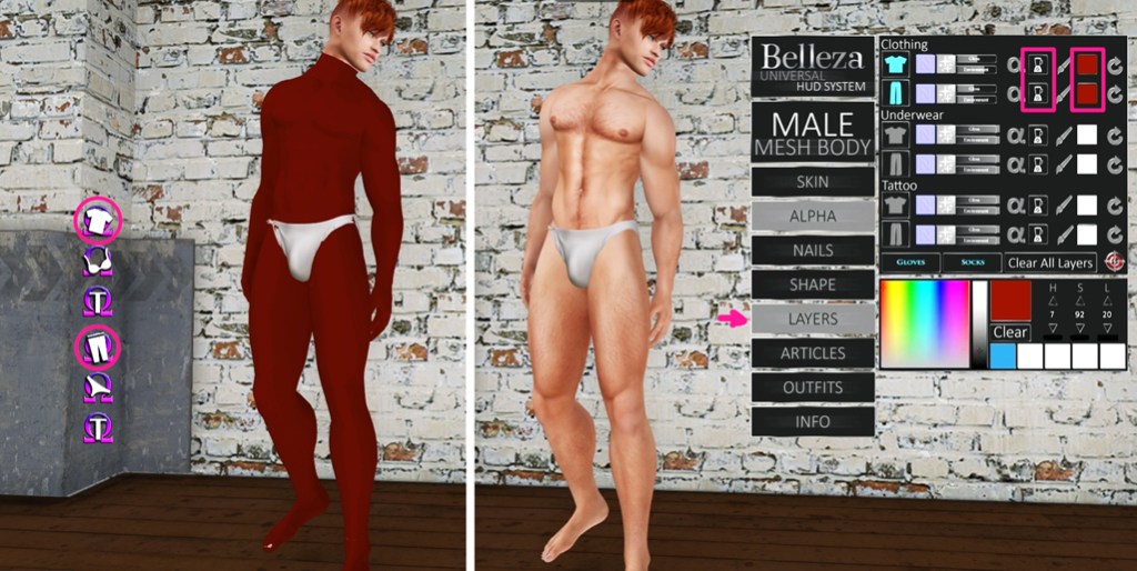 It is quite normal at this stage for the hair to appear as a solid white or coloured layer on your body. To fix this you need to go into the Belleza body hud and take a look at the Layers tab. You will notice the body hair has been applied to the clothing layers. You could of course have used the underwear or tattoo layers, depending on which layers you were already using for something else. To the left of the brush icons you will either see a blender or mask icon. Toggle this to make the body hair visible. You can then tint the hair by clicking on the colour sample next to the brush and picking a colour in the lower half of the hud. You can fine tune the colour with the up and down arrows for the RGB values.