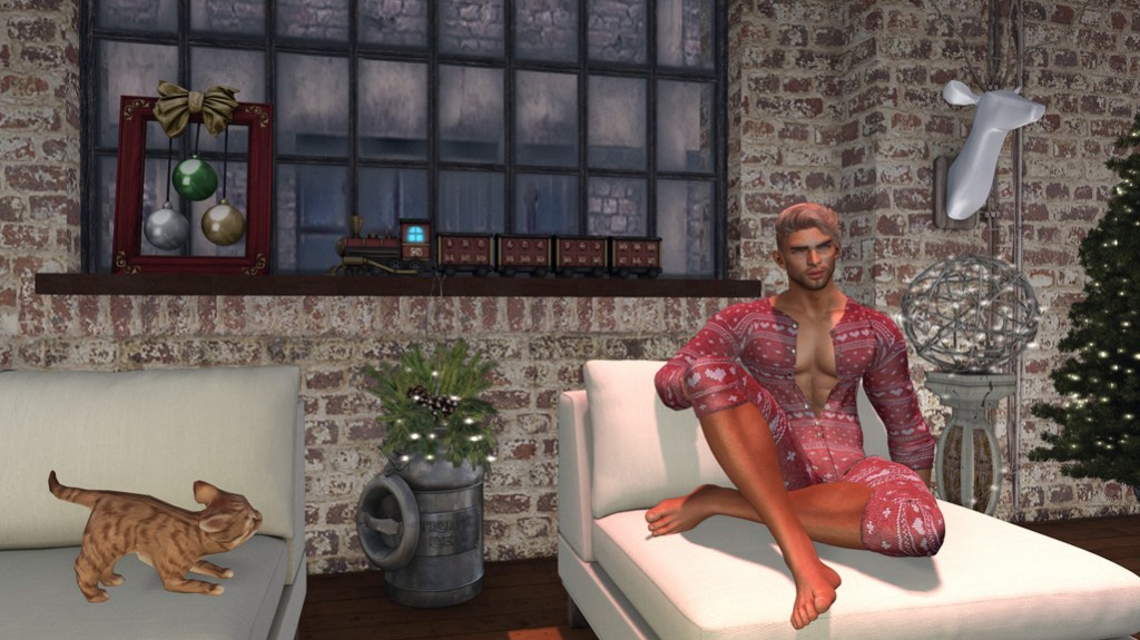 Items are shown on the Belleza body with the Lelutka Guy mesh head (freckles and stubble included), Birth Ripley skin, Stealthic Narcotic hair, IDTTY “Real” eyebrows and Moncho eyes by Madame Noir. I’m sitting on the N4RS Famous chairs and my Jian kitten is having a little stretch.