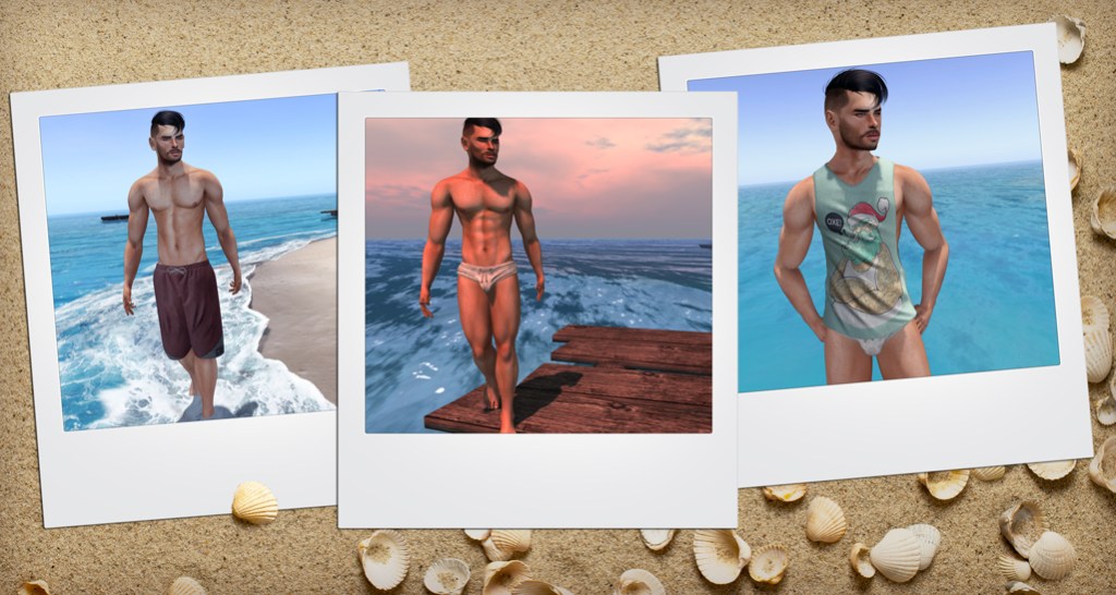 So what do we get? A pair of baggy shorts by Narcissus, a cute pair of swimming trunks with a subtle snowflake patter by Matova and an even cuter tank top by Oxe (I love that print!)