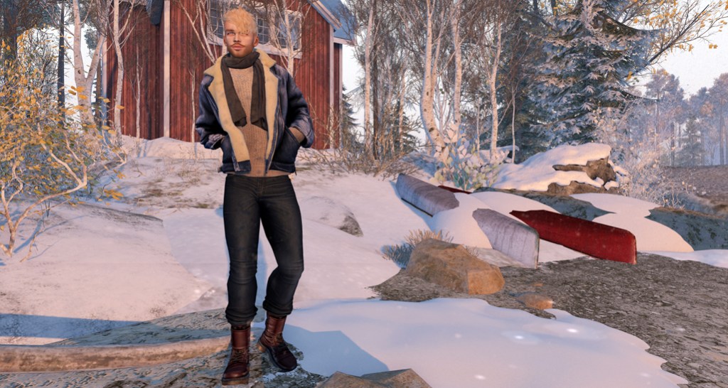 For this next outfit you could be working with pretty much any mesh body or even no mesh body, because you’re totally covered up. The MGMen’s jacket, sweater and scarf, L&B Havoc Ops tucked jeans and boots are all from TMD, so right now this is a one-stop outfit. I find it cheeky from MGMen that they charge extra for the sweater, as it’s not possible to wear the jacket without it because then you have a gap between the sleeves and the pockets of the jacket, where your wrists should be.