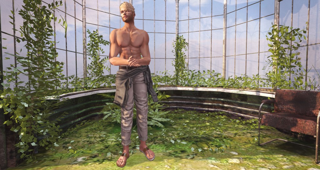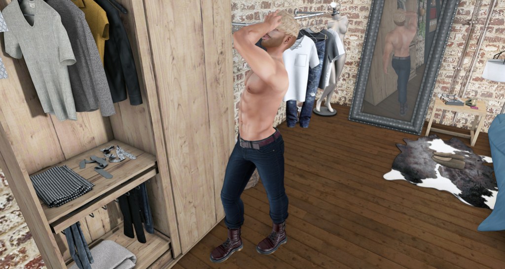 The gorgeous leather (faux sheepskin?) Maverick jacket by Minimal at TMD comes with a built-in T-shirt, but it makes me happy to see that the shirt can be taken off to show a little skin. I’m using the Signature size for the jacket and luckily there are some jeans that work well with David in the Aesthetic (Enzo) size. The Gary rolled blue jeans by Legal Insanity are a good example. You just need to adjust your shape slightly, so your legs don’t look much bigger in the jeans than when you are naked and also to stop you from glitching through the waistband. You’ll effortlessly slip on the NX-Nardcotix Jude Ankle Boots under these jeans and in the words of a magician with a lisp: “hey pesto!” you’ve got yourself an outfit. What? No laughs? Tough crowd.