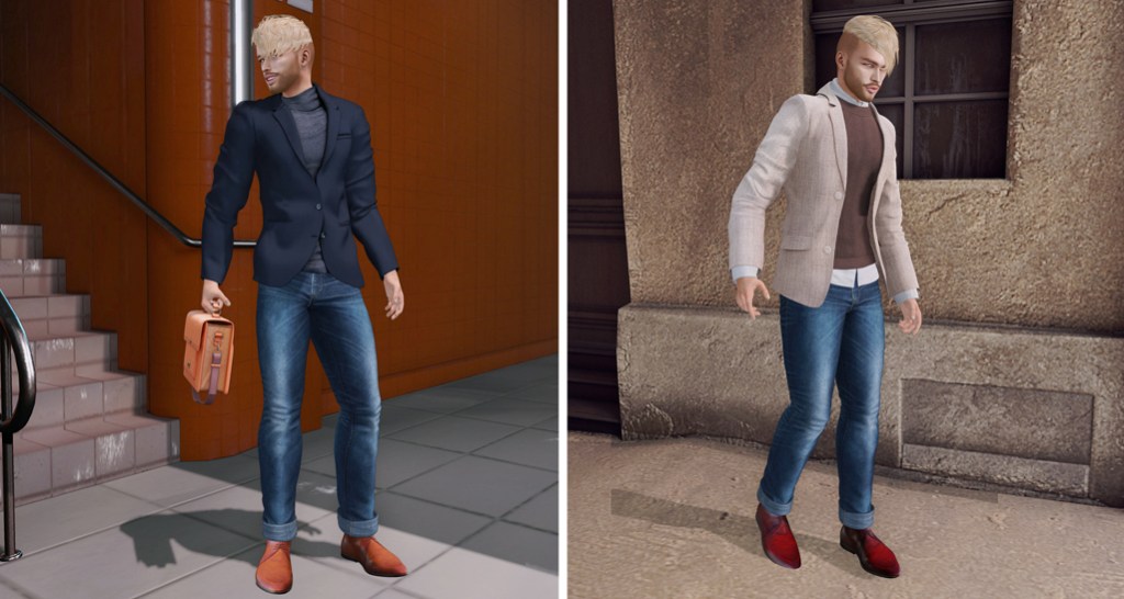 Now for something smart casual. As much as I like underwear, I also get a kick out of seeing my avatar in a sharp suit or that sexy combo of a suit jacket and jeans. There are two options for this kind of look at this round of TMD. On the left you see the Not So Bad Erwin suit jacket and on the right there’s the Tori Torricelli Byron jacket. Both are worn with the L&B Havoc jeans (available at the L&B main store, not to be confused with the tucked jeans they have at TMD now) and the NX-Nardcotix Jude ankle boots.