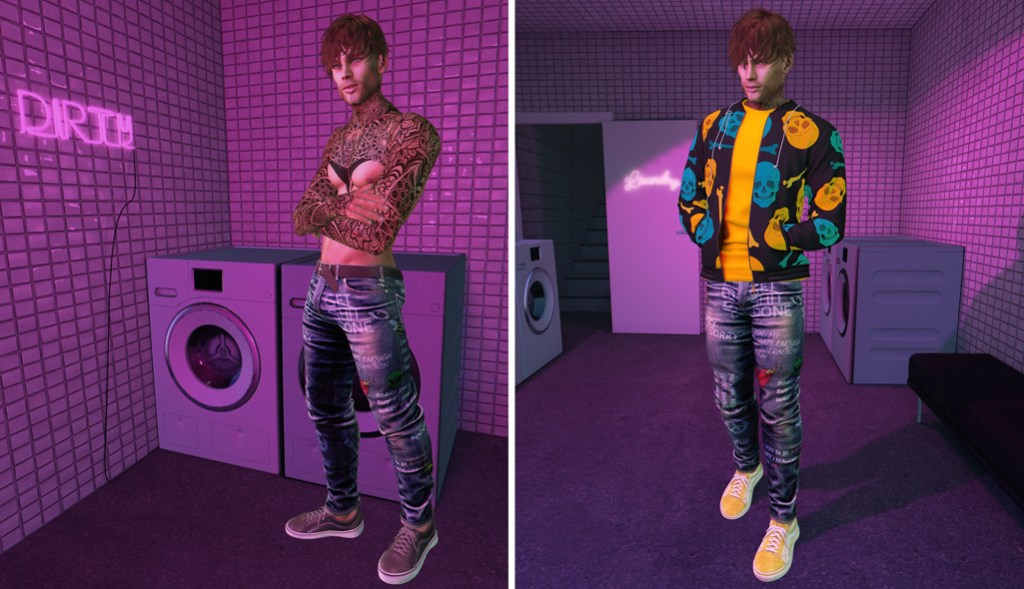 While I got the Dappa tattoo at TMD, I also spotted a bomber jacket by Kai that showed potential. I’m wearing it in the Gianni size and switched the Legal Insanity jeans to the Gianni size as well to avoid glitching. You may want to play with your shape again, as the jacked unrealistically billows a little in the back if your butt is too big. If only we could adjust our real life shapes this easily to fit into a pair of jeans, instead of having to search for the perfect pair! Oh well, que sera fat-ass sera. If you’ve missed this round of TMD, check out the Kai main store and you’re bound to find the Noiz bomber jacket there.