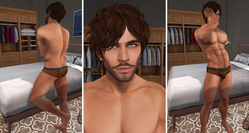 Let’s also take a closer look at the new Dagger applier by Birth for Catwa mesh heads. This handsome s.o.b. goes well with David’s athletic physique. Then again, a garbage bag would go well with that physique. With a nicely furrowed brow, Dagger has that focused smoldering look that’ll make you weak in the knees, although that might just be osteoporosis. It’s also worth mentioning I always like the beard options that come with most Birth skins (I guess not the female skins).