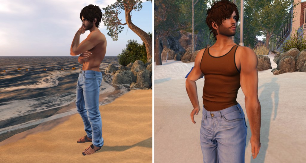 The new Leny denims by Not So Bad, currently at TMD till the end of April, is an example of a pair of jeans that fits best in the Enzo size if you want to wear them shirtless. What’s extra fun in this case, is that the tank top that comes with the NX-Nardcotix Darrel underwear set fits nicely in these jeans without clashing. That’s a rarity! You may want to adjust your shape, as a high muscle percentage on your legs will make them look extra puffy in these jeans and with a big butt there will be more of gap at the back. With the NX-Narcotix Mecatle sandals this makes a nice early summer outfit. Which reminds me, why is that when in autumn the temperature drops to 10° C (50° F) people start wearing winter coats but as soon as it reaches 10° C at the start of spring, they start going out in a t-shirt, freezing their nipples off but to proud to admit it? I’ll let you think on that while I leave you with the credits. Ciao!