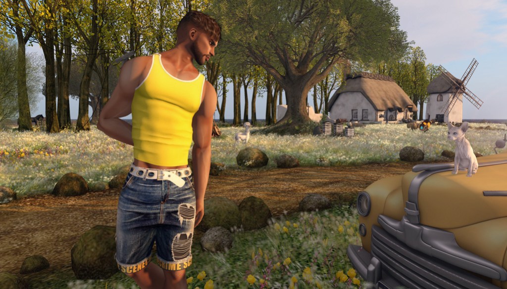 Also at Fameshed you can find the Legal Insanity Wesley Denim Shorts. Here I go with the Enzo size for the best fit. Now in an ideal world you’d be able to wear these ripped shorts without the patches and show more skin, but unfortunately that’s too much to ask for in this case. I could not make that work without glitching through the shorts while I was walking. On the plus side, because these shorts are quite low on the hips, you can easily wear them with the tank top from the NX-Nardcotix Darrel underwear set and show an inch of midriff. Houston, we have bare skin! With that I have come to the point to wrap things up.