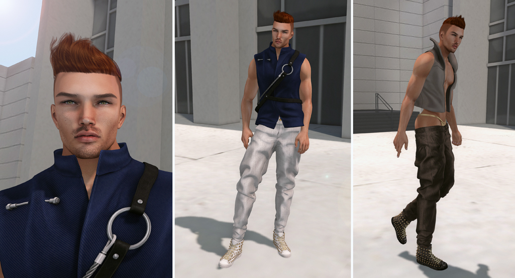 The baggy trousers and studded sneakers by TMP haven’t aged too badly, but unfortunately these items are no longer available. The “shoulder harness” top by Gild is still available and is rigged for Signature, Slink and TMP, which means it probably works with the Classic Meshbody as well. There are some subtle differences between the original TMP Deluxe and the current free Classic Meshbody, but the creators took care to make sure most existing clothes would still work with it. The open vest by Gabriel could be a bit trickier to use with the Classic Meshbody. This vest is from one of the many gacha sets at Gabriel (L$75 a spin) and you can try a demo first to make sure that anything you manage to get out of those one-armed bandits will work for you. The Metallic Thong by Noche should still fit well. I always loved how I got away with wearing this thong with (very) low baggy trousers, because includes a flat-fronted “size 0” version so your bulge won’t poke through your trousers. Try it with a pair of low jeans, it’s just so damn Cheeky!
