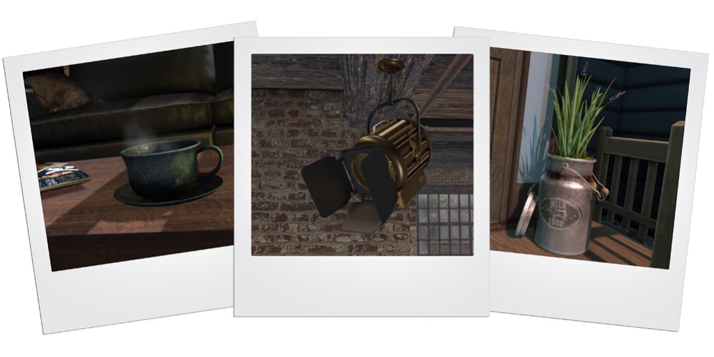 Alright alright alright, let’s look at the first three gifts. I’m cutting down on coffee in real life, but I’m sure this lovely coffee cup by Cinoe will not impact my blood pressure, in the same way that Second Life™ gave new meaning to the expression “empty calories”. I was chuffed when I first unpacked the beautifully constructed gold studio lamp by Bondi, but a bit miffed by the absence of a light script. I added my own invisible globe with a directional light to make it more useful. It now throws a light on my bed… bow chicka wow wow. If you have a house in a rural setting, you will appreciate the milk can planter by Rezz Room. I recently traded in my old Linden Home for one of the new Bellisseria homes and this planter looks quite welcoming on the small porch by the front door.