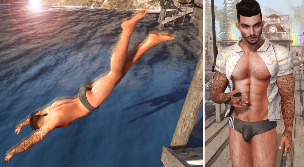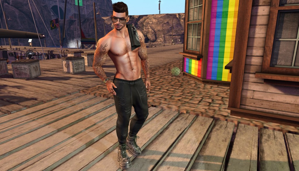 There’s the Miguel skin by Not Found in four skin tones. It’s for Lelutka mesh heads, but it’s an applier without bom layers so it’s not ideal for the Skyler head, but it does look great on Guy. As usual with these skin gifts, the body applier isn’t included so you’ll have to hop over to Not Found to pick it up at the friendly price of L$345 per skin tone, which includes various versions with and without defined abs. Heck you can even go a bit chubby with this one, which is rather unique in SL. I’m wearing Jude sunglasses by Ohemo, the Simple Wrist Watch by Gutchi, a shirt over my shoulder by Invictus, Arie joggers by VUK (rigged for Signature and Legacy), Aqua Boots by Grailed and the Fawn tattoo by Dappa. All these items are gifts from Access. It’s rare that you can put together a whole coherent look with just gifts. I’m using the Lelutka Guy mesh head, Legacy mesh body and Modulus Cole hair (a gift at their store).