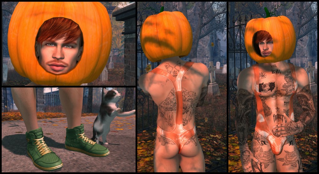 I have no need for the crossbow this year, because I’m not getting really into a very engaging hunt right now, though I’m sure they are out there (check out MadPea). The Nomad Pumpkin Hat is making a comeback from that old outfit and you can see that it’s more amusing than the slightly scary pumpkin head I was wearing the other day. I’m not sure where I’ll be going with this outfit. This is considered acceptable club wear in places I myself have only ever heard people talk about in real life. Consider that Second Life™ is real life on steroids, and the possibilities of where I can shake my booty to some groovy tunes in this getup are endless. So I shall sashay away and let you admire the view as I leave the room for now.