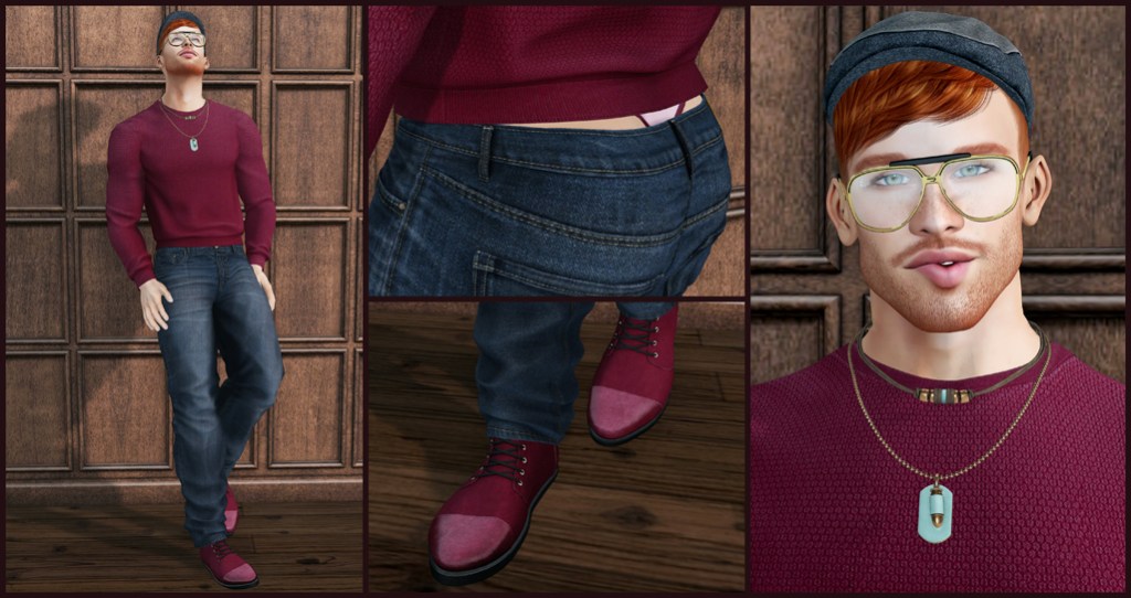 I went through several pairs of jeans and you can of course easily wear this sweater with the Noche Hayden jeans, which leaves no gap. Personally I was charmed by the little gap you get when you wear this sweater with the Deadwool Kojima jeans. This created an irresistible opportunity for flashing just a bit of thong. Oh, Naughty! That’s going to cause some zooming in of cams, I’m sure. Oh SL, so many perverts, so little time.