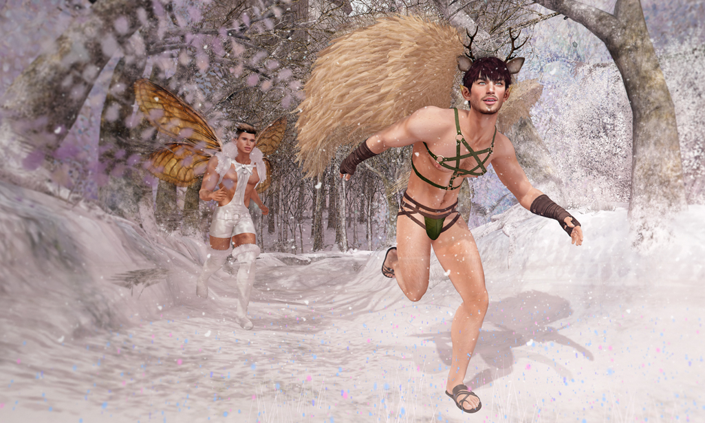 My scantily dressed sexy fairies may not be to everyone’s taste, but I can live with that. After all, it is my Second Life™, not yours. Truth be told, I don’t think there is a very rich range of traditional high quality male fairy outfits to choose from in SL. In my mind something with a lot of straps makes kinda sense, so I naturally gravitate towards something like the Noche Evan Harness and Ayo Jockstrap. True, these items could easily be worn in a completely different setting (anyone else thinking sex dungeon?), but using the more earthy tones and wearing them with the Noche hand bandages, gives me a kind of daring sexy battle fairy vibe. Again, you don’t have to agree with me. It’s not like I care what you think, dear reader… Please say you like it! Pretty please with a cherry on top. Oh! “Cherry” Naughty! Hehe! Nudge nudge wink wink. Right! Enough with the dilly-dallying. Credits is what you need, so here we go up, up and away.