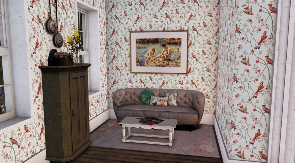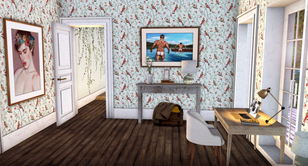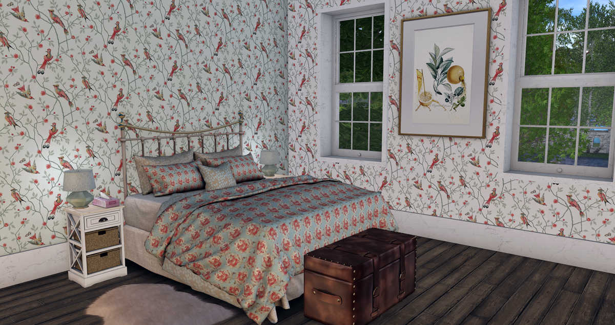 I think I was running out of prims at this point, or possibly out of patience, or maybe I didn’t want to over burden the sim, so I kept this guest suite very uncluttered. Throughout this house I used an interesting mix of wall papers, which I found by just looking for real life samples online and turning them into seamless patterns when necessary. The Meadow bed and Maurice side table by Lisp Bazaar look quite at home in the country setting of this house. The Judy lamp by MudHoney works well as a light to read a book by and when my guests need something to sit on to gracefully put on their socks and avoid that clumsy one-footed hopping around, they can use the leather strapped trunk by Apple Fall. The art is by Dali, but the frame is from the Apple Fall botanical study.
