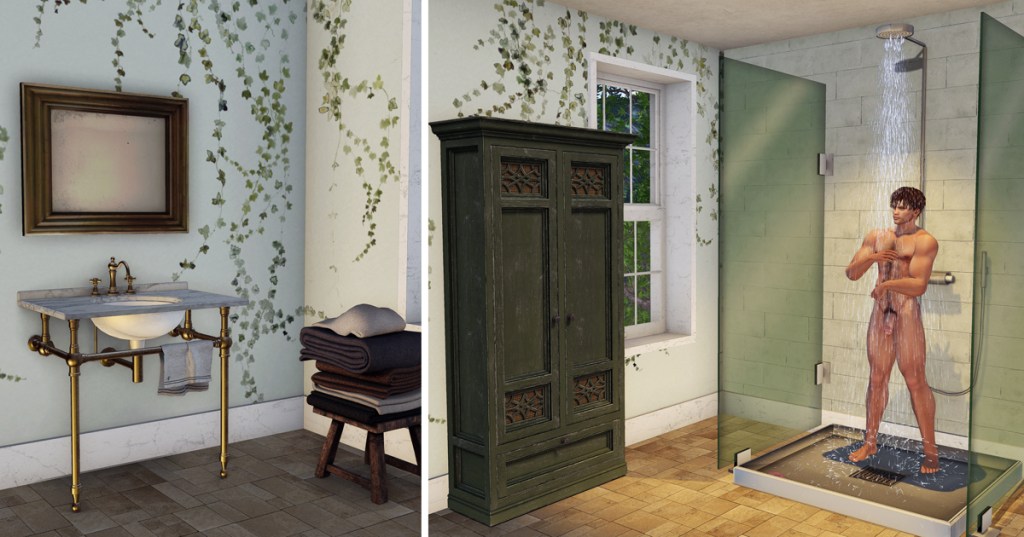 Obviously I absolutely cannot have a guest suite without an ensuite. I imagine this part of the house has been modernised at a later stage and instead of putting in a classic bathtub, I’ve opted for the sleek N4RS Wet Man Shower. Guests will find an ample supply of floofie towels in the Apple Fall Noel cabinet and some more towels are already waiting for them on a little Nutmeg wooden stool for immediate use. Because I don’t think there’s anything wrong with mixing utilitarian sleek design with a more rustic style, I installed the Apple Fall Lange washtand and hung up the Dutchie antique mirror. Et voilà, there’s your ensuite.
