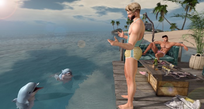 Check out my blog post about the Akeruka Advanced M03 mesh head to get the credits for the (bottle) blond avatar. The derelict room in the first shot is a group gift at Minimal and the building you can see through the window is also by Minimal. The second shot by the water with the dolphins was taken at Serendipitous Sands.