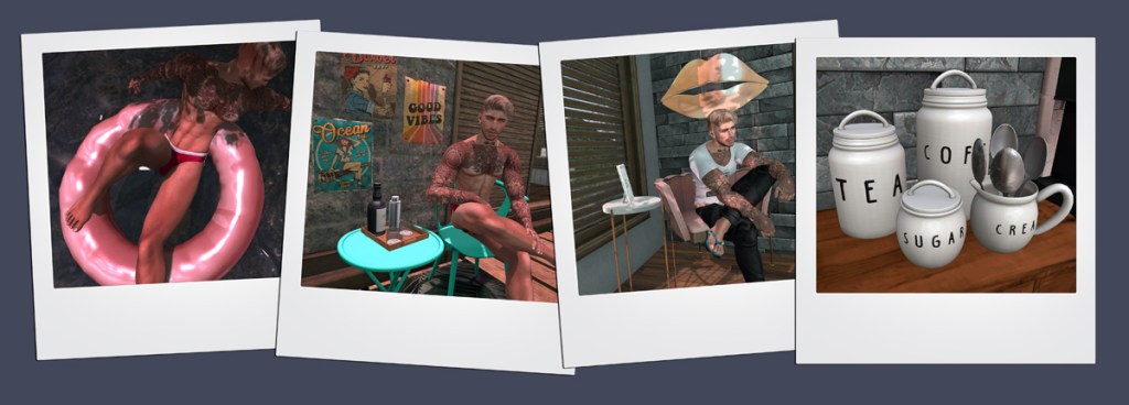 If you have a home in Second Life™, then I’m happy to report there are several gadgets, gismos and thingamabobs that might definitely excite a certain kleptomaniac mermaid, but which will probably look even better in your home than in her cave. Let’s see what we have here. There’s a float by Raindale which comes in pink and yellow and you get a candle holder with it (not shown in image). From Wrong we get a set consisting of a very bright turquoise chair and table with a tray, a bottle of whiskey, a shaker and a couple of glasses. Behind that scene you can see a set of vintage metal boards by Broken Arrow. There’s another lovely set by Kraftwork and this one has a stylish delicate lounge chair, a side table, a little frame to pop a picture in and lips to use as wall art (makes a nice change off all that ass kissing you’ve been doing at work, right?). Finally there’s some kitchen / coffee corner decor by YD (which stands for Your Dreams). I say “finally”, but in truth there are many more gifts, not to mention all the wonderful creations you can purchase at ACCESS. So go on, had of your lazy virtual bum and head over there.
