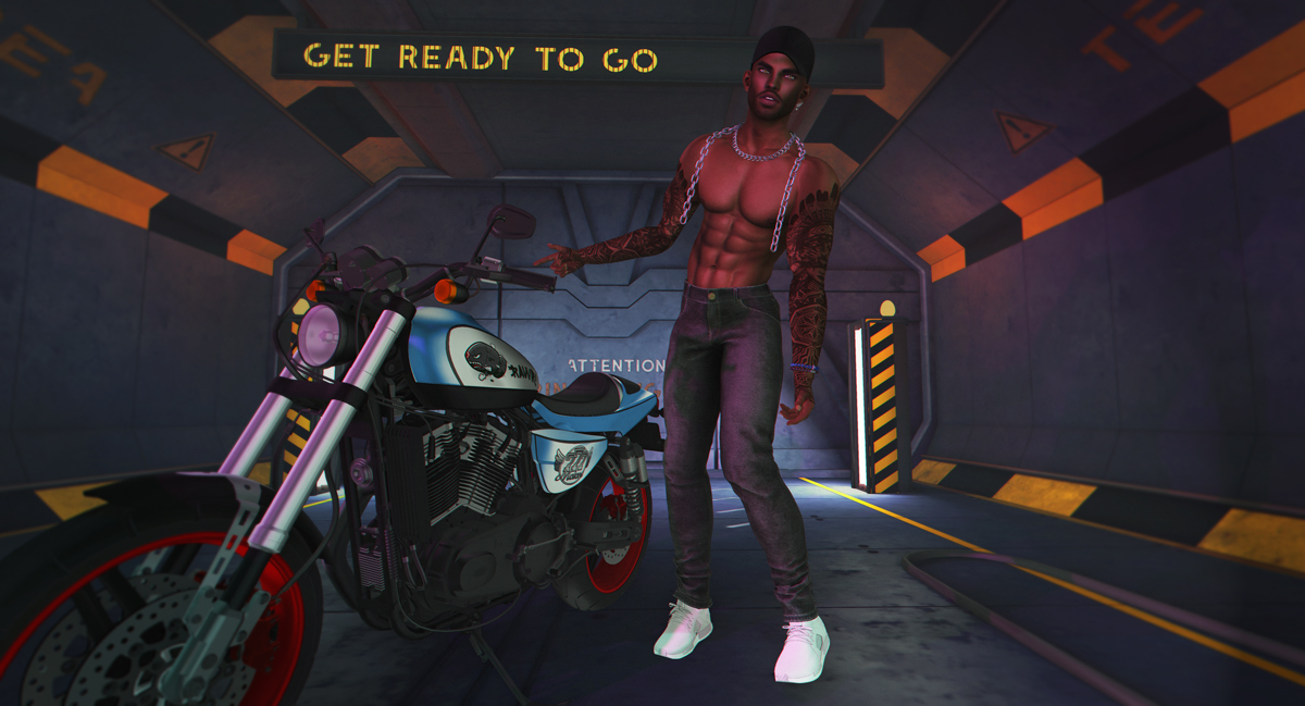 I’ve just finished the Men Only Hunt and as I’m unpacking everything, my first blog post about this hunt will focus on a look with the NX-Nardcotix David mesh body, using some of the hunt items. The backdrop is by K&S, they bike is by 777 Motors and the pose is by Empowered. These three items are all in the Men Only Hunt as well as what I’m wearing in this shot.