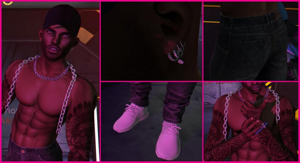 Now for the hunt items I’m wearing: The S21 Jeans are by Cheerno. I’m wearing these in the Enzo size and I altered my shape to make them look right on David. The chain necklace is by Amias and rigged for Gianni, but it doesn’t cut into the body much. There is an unrigged version included, but as that doesn’t move with the neck, it tends to cut into the body more. The body chain is by Afterparty and is unrigged so in theory it works with any mesh body. Head over to Vegas Tattoo to find the Apache tattoo. Bom layers as well as appliers are included. You can use the Omega applier for David, but you will need to have the Omega relay for this body for that to work (available at NX-Nardcotix). The KobZache cap goest rather well with this shirtless quasi bad ass look, don’t you think? The simple pair of white sneakers by KC & Native Urban go well under those faded black jeans, though if you look really close you will see a gap were some ankle should be showing (you win some, you lose some). Personally I thought the earrings by Raon Hausen Beauty and bracelets by L’Emporio & PL were the bit of bling needed to finish the look off.