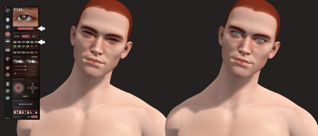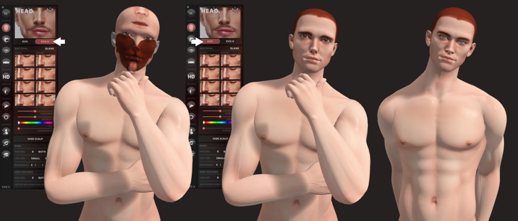 If at this point your eyes are just empty red sockets, it means that they are set to BOM. There are two things you can do. You can remove ALPHA (BOM Head + Body – APPLIER Eyes) from your outfit and the eyes of the standard avatar will be baked on the mesh eyes that come with the body (sounds kinda painful!). You can also leave that alpha on and click on one of the eye textures in the HUD, which is what I have done here. This avatar is coming along nicely already and we haven’t even looked at skins yet. The standard avatar skins are quite bland and lacking in detail, but luckily there are lots of options available from various skin creators for the combination of the Belleza Jake mesh body and Lelutka mesh heads.