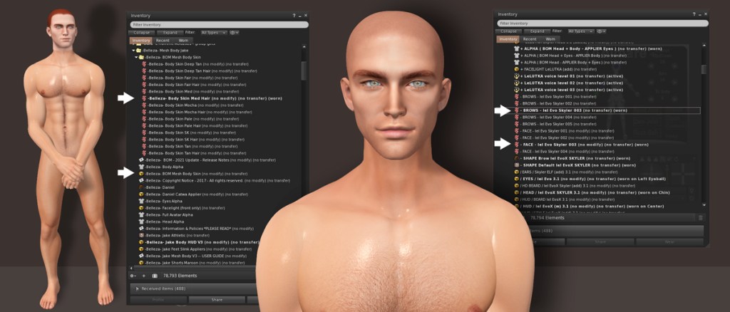 Before you head out to purchase a skin, you may want to look at the options that come with the Belleza Jake mesh body and Lelutka Skyler mesh head. In the folder for the Jake body you will find an item named Belleza BOM Mesh Body Skin. Unpack this item and you’ll get a folder with 14 skins, consisting of 7 skin stones, each one in a smooth and hairy version. I chose the “Med Hair” version here. Now go back to the folder for your Lelutka mesh head and look for the four BOM skins, named “FACE lel Evo Skyler 001” to 004. I’m using 003 here, which seems to match up naturally with the body skin. I don’t think this would have been possible with the previous version of the Belleza body, but because the BOM skins have been made to blend into each other, you don’t get an ugly seam on your neck. If you’re still pretty new to Second Life™ (hello, welcome, have fun, please don’t be scared), you might think: “so what?”. But if you’ve been knocking around here for a while, the absence of a neck seam is a blooming halle-forking-lujah moment! Next you can add your eyebrows which ar also available from the Skyler folder. The fun doesn’t stop here yet with the addons. Go ahead and unpack all the items in the Lelutka head folder that have a name that starts with “unpack” and I’ll see you on the other side.