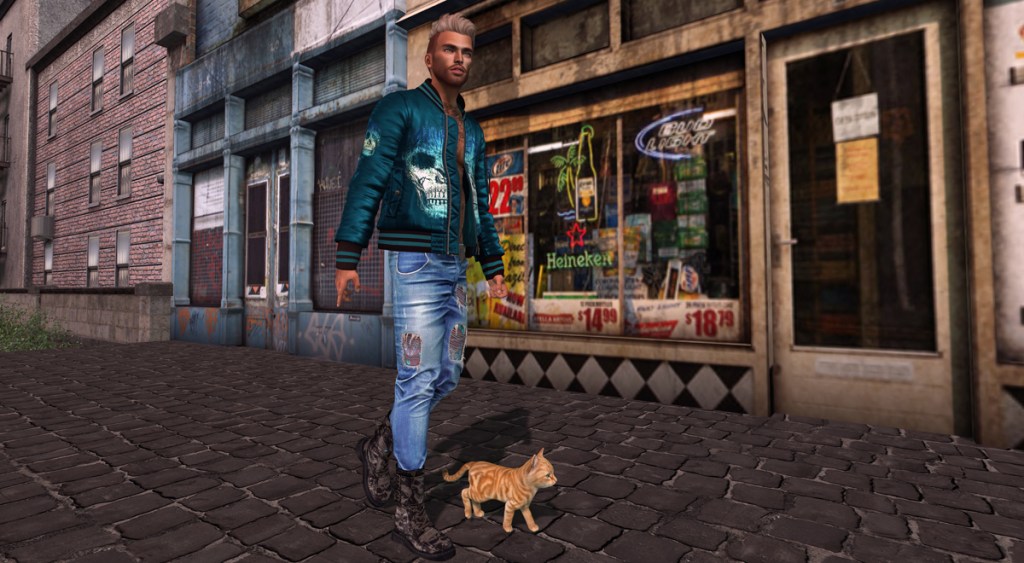 I also bought the L&B Swear Morte bomber jacket at MOM. It comes in a range of Halloween themed prints and I went for that looks spooky but can still be worn past Halloween. The ones with pumpkins are slightly less versatile in my opinion, but a skull works any time of the year. Even Christmas… there are always some skeletons dropping out of closets on those Christmas family parties. The jacket has a built-in t-shirt with a number of texture choices and as you can see, you can also hide it The boots are also by L&B Swear and are one of the gifts at MOM (until tomorrow). For my jeans I went with the trusty Lewis Denims by Legal Insanity. Usually when I wear any pair of trousers by Legal Insanity with David, I use the Aesthetic (Enzo) size. In this case I’m using the Gianni size, because those can be tucked in the L&B Swear boots. It just meant I had to play a bit more with my shape to make the jeans fit.