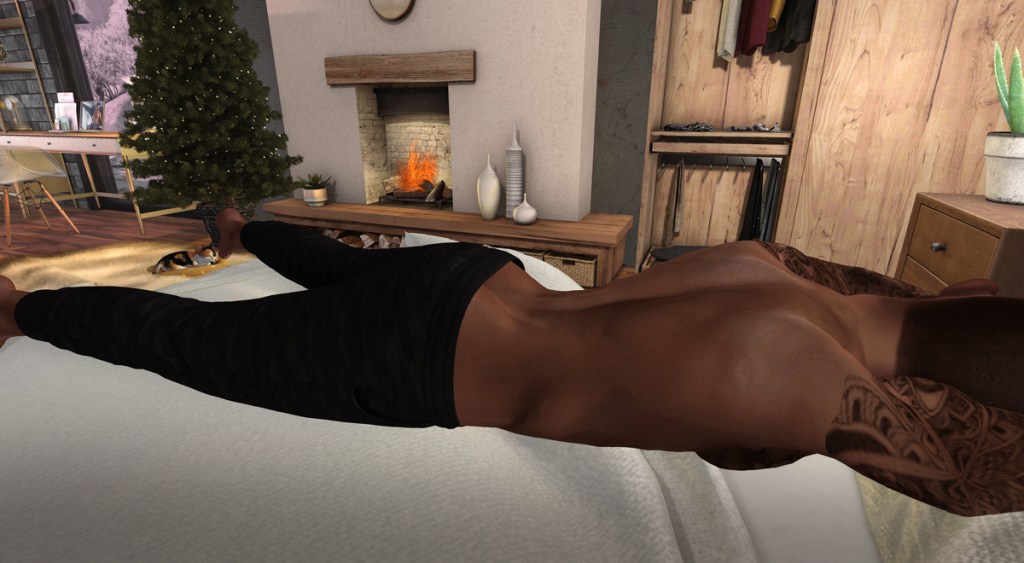 Once back home, I made good use of the sweatpants I picked up at the event. They’re a gift by Etham and although sadly there’s no size that directly supports the David mesh body, I found that I could make the classic size work with a bit of squeezing and pulling (a.k.a. shape adjustment). And at this point I’m very much ready to hit the sack in real life too, so I’ll leave you with some credits and call it a night.