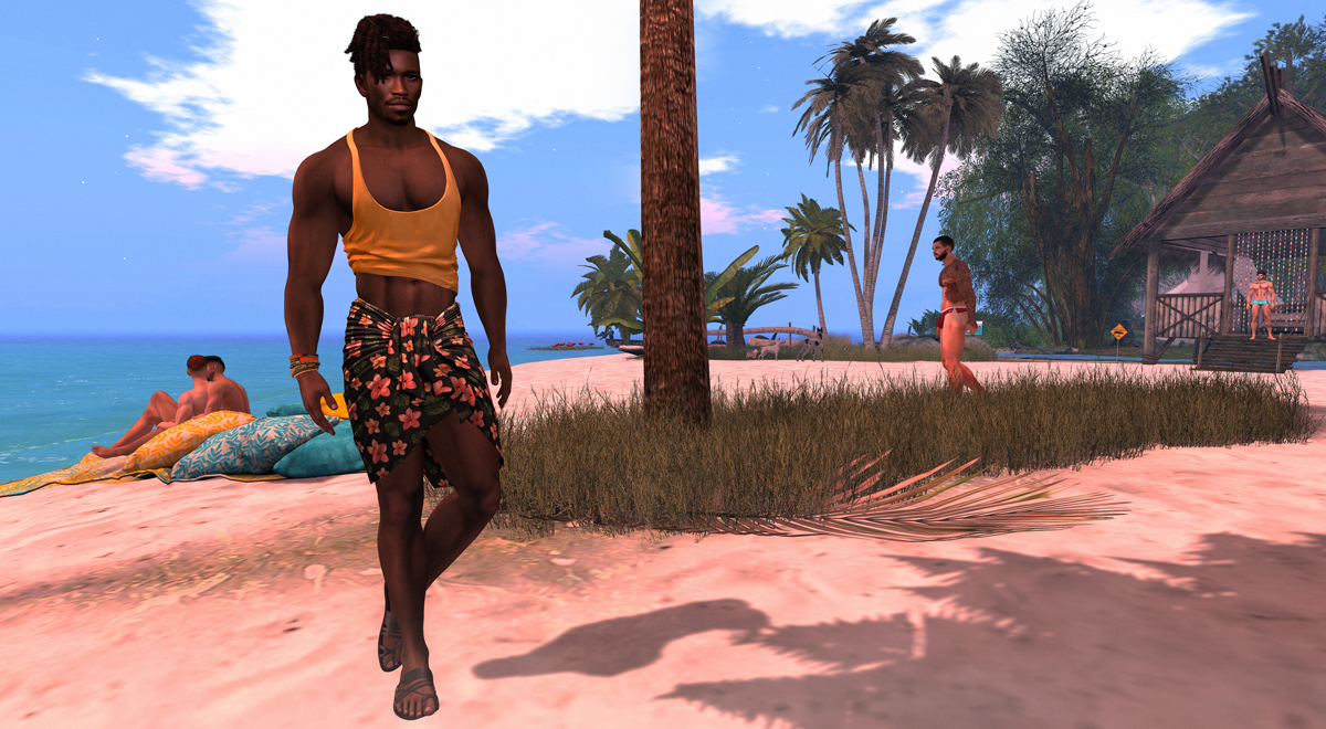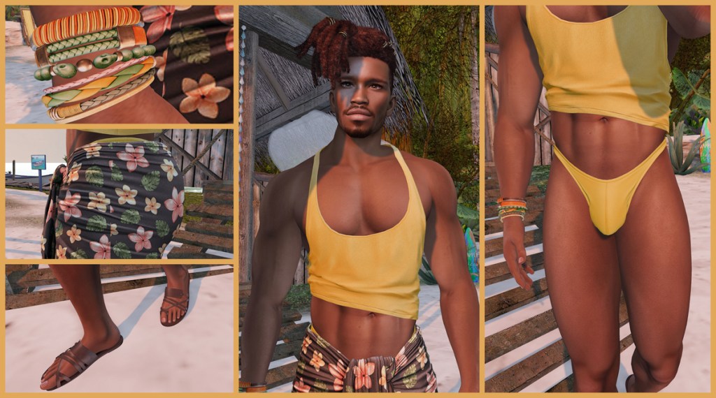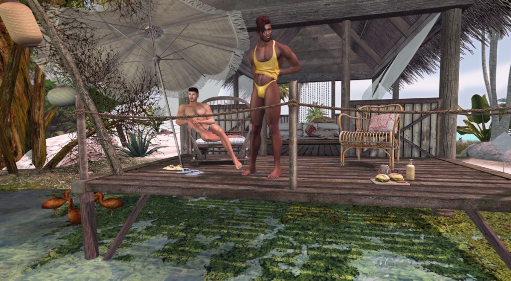 I especially like the huts you’ll find dotted around the sim, with the sheer curtains romantically blowing in the wind and a terras overlooking one of the lakes. You should also keep an eye out for some really exciting wildlife, ranging from colourful parrots to majestic elephants. So while I wander around a bit more and take in the sights, I’ll leave you with the credits of my beach outfit and then I’ll be hitting the sack in real life, in an attempt to get those optimal 8 hours of sleep before the rat race I call a job starts again tomorrow morning. *sigh* Why can’t it be two days of work and five days off?
