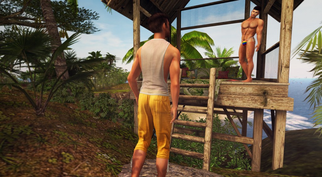 I would have loved a Corfu inspired sim, but I didn’t want to spend too much time trying to find something perfect. It’s not like I was going to find the Durrells waiting there for me. In SL I feel most attracted to sims that are somewhat explorable. Salt Water is a rugged, tropical island that climbs slowly from a western bay up to high plateaus and with its lush vegetation, interesting ruins and some romantic spots, this island definitely has that explorable factor.