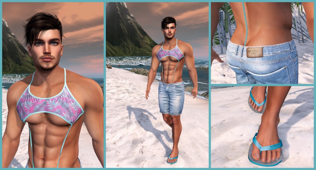 I experimented a little with Noche’s Shen Monokini and found that I can wear the version with the size 0 bulge together with a pair shorts by Legal Insanity on the Legacy mesh body (it probably doesn’t work on Belleza) and I’m filing this under “another small victory”. Save this as and outfit and save an other outfit with just the monokini (with a larger bulge size) and you’re always ready to switch from sunbathing / swimming mode to a slightly more appropriate look for walking around or having a drink at the beach bar.